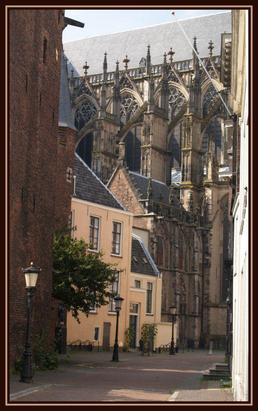Между колокольней, возвышающейся над площадью и собором можно увидеть следы стен и пилларов, разрушенной церкви. Кафедральный собор, стоявший на этом месте, к сожалению, не сохранился. Он сгорел при пожаре, а на его месте был построен новый собор, который охранился до наших дней. Колокольня, которая является одним из высочайших памятников Голландии, так как высота ее составляет 112 метров, составляет часть соборного ансамбля, ее стоительство было завершено в 14 веке. Но часть анфилад, соединяющих собор с колокольней не сохранилась до наших дней, так как была разрушена при урагане в 1674 году (стоительство проводилось при недостаточном финансировании - как это нам знакомо! - поэтому материалы брались самые дешевые, и сама конструкиция была недостаточно прочная). Понадобилось несколько десятилетий, преджде чем обломки убрали, а площадь расчистили.