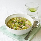 Обжариваем мелкорубленный лук, добавляем к нему столовую ложку муки, красный перец, столовую ложку томатной пасты, измельченный чеснок. Готовую зажарку отставляем в сторону. Картошку чистим, разрезаем на половинки и бросаем в кипящую воду. Курицу режем мелкими кубиками и обжариваем. Когда картошка сварится, воду не сливаем, бросаем к картошке курицу. Даем закипеть, забрасываем зажарку и оставляем на 3–5 минут покипеть. Посыпаем зеленью.