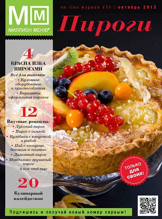 Сегодня мы можем купить в магазинах лакомства на любой вкус. Но зачастую, пресытившись этим разнообразием, все же скучаем по домашней выпечке: бабушкиной румяной булочке с корицей, маминому пирогу с картошкой и мясом или пирожку с капустой... Выпуск этого номера журнала посвящен пирогам. Мы расскажем о необходимом для каждой хозяйки кухонном оборудовании и принадлежностях для выпечки, о различных вариантах оформления пирогов. И, конечно же, предложим множество интересных рецептов пирогов с самыми разными начинками. Наши рецепты и советы помогут даже начинающим кулинарам готовить по-настоящему вкусную выпечку, получая удовольствие от хорошей кухни.
