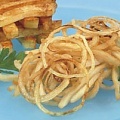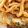 Лук нарежьте кольцами, запанируйте в муке и обжарьте в растительном масле до золотистого цвета. Обжаренный лук выньте шумовкой, выложите на сито и, когда стечет масло, слегка посолите.