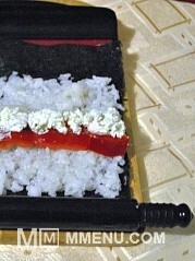 Для приготовления роллов выкладываем на наш замечательный коврик тонким слоем рис и начинку. Рис должен занимать около половины площади листа нори, не больше! Не забудьте положить побольше начинки. Домашние роллы тем и вкусны, что с начинки именно столько, сколько хочешь, а не сколько тебе положит дядя-сушист, у которого свои инструкции на этот счет))))