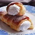 Напечь блинчики. Свернуть их трубочкой и заправить кремом.
