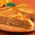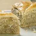В форму для торта, ополоснув ее холодной водой, уложите, чередуя, 4 сочня и миндально-кунжутную смесь. Накройте оставшимся сочнем, смажьте его взбитым желтком.