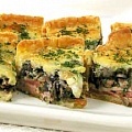 Готовый фарш осторожно выкладывают на нижнюю лепешку, закрывают второй лепешкой, края соединяют и защипывают. Поверхность пирога украшают фигурками, вырезанными из обрезков теста, смазывая их с нижней стороны яйцом. Ставят пирог в теплое место и снова дают подняться. Перед выпечкой делают несколько проколов вилкой для выхода пара и смазывают яйцом.