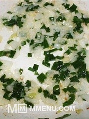 Репчатый лук нарезать мелким кубиком и слегка обжарить в растительном масле, добавив зеленый лук - 3