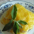 Перед подачей апельсины очистить, удалить белую пленку, разделить на дольки, положить сверху в формочки и полить сиропом.