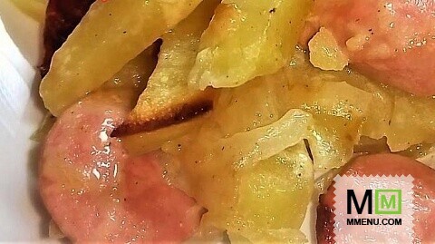 2) В это время очищенный картофель нарезать крупной соломкой, сосиски кусочками. - 3