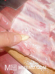 Свиную грудинку хорошо помыть и нашпиговать морковью, чесноком и перцем. Поперчить и посолить с обеих сторон. - 2