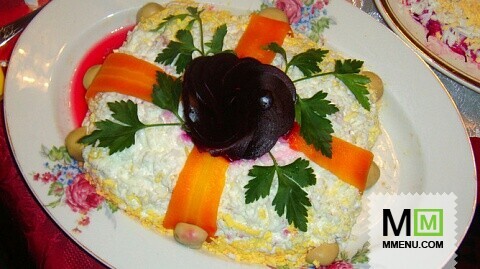 Украсить салат, можно розочкой из свеклы, лентой из моркови и петрушкой.