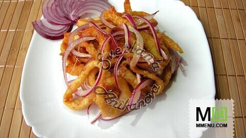 1. Нарезаем кальмары кольцами, обваливаем их в муке и обжариваем в раскаленном растительном масле без запаха.