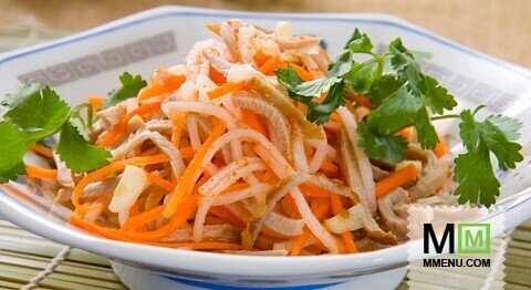 1. Морковь, дайкон и свинину нарежьте соломкой. - 2