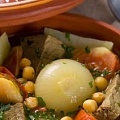 Баранину нарежьте кусочками по 40 г, выложите в чашу мультиварки, добавьте нут, целые очищенные головки лука залейте холодной водой, закройте крышку, выберите режим «Бульон» и нажмите кнопку «Старт».