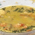 Обработанные грибы сварить (объем воды — 0,75 л), нашинковать. Грибной отвар процедить. В кипящий отвар положить грибы, морковь и лук, нарезанные соломкой и пассерованные, цветную капусту, разобранную на соцветия, и варить при слабом кипении 15 минут. В конце варки положить зеленый горошек, мякоть креветок, специи и варить еще 5 минут.