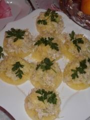Салатик сельдерей,ветчина,сыр твёрдых сортов,отварная куриная грудка всё измельчить ,заправить майонезом выложить на кольца консервированных ананасов украсить натёртым сыром и зеленью.