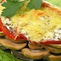 Ломтики баклажанов выложите на смазанный маслом противень, сверху — грибы, помидоры и смажьте смесью из сливок с чесноком.
